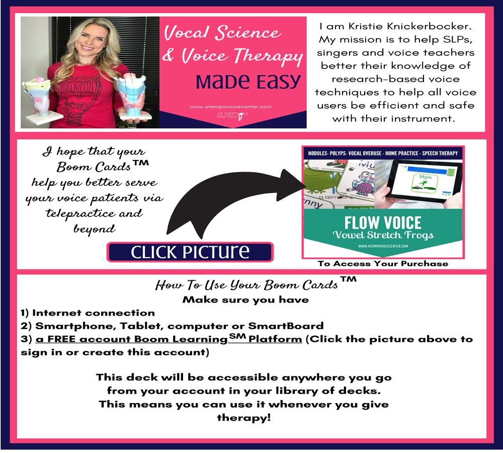Flow Voice: Vowel Stretch Frogs for Voice Therapy Boom Card Deck. Use easy “flow voice” to help kids with nodules, polyps and vocal overuse patterns improve speech and voicing with clickable games through Boom. This is PERFECT for Telepractice.