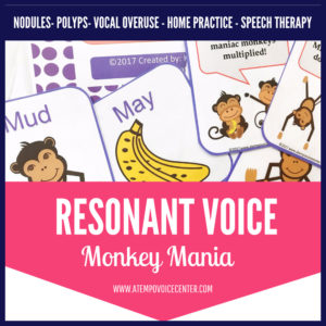 "Monkey Mania!" for Voice Therapy. Use Forward-Focused Resonant Voice to help kids with nodules, polyps and vocal overuse patterns improve speech and voicing. Add hums to the beginning of all words and sentences, then drop the hums as the child gains skills with this type of voicing. Includes fun game board and spinner to help vary the types of hums to keep things interesting. Over 95 kid-friendly colorful cards.