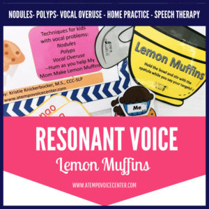"My Momma Makes Lemon Muffins" for Voice Therapy. Use Forward-Focused Resonant Voice to help kids with nodules, polyps and vocal overuse patterns improve speech and voicing. Add hums to the beginning of all words and sentences, then drop the hums as the child gains skills with this type of voicing. Includes fun game board and spinner to help vary the types of hums to keep things interesting, as well as an oven pattern and a mixing bowl with a spatula. Over 90 kid-friendly colorful cards.