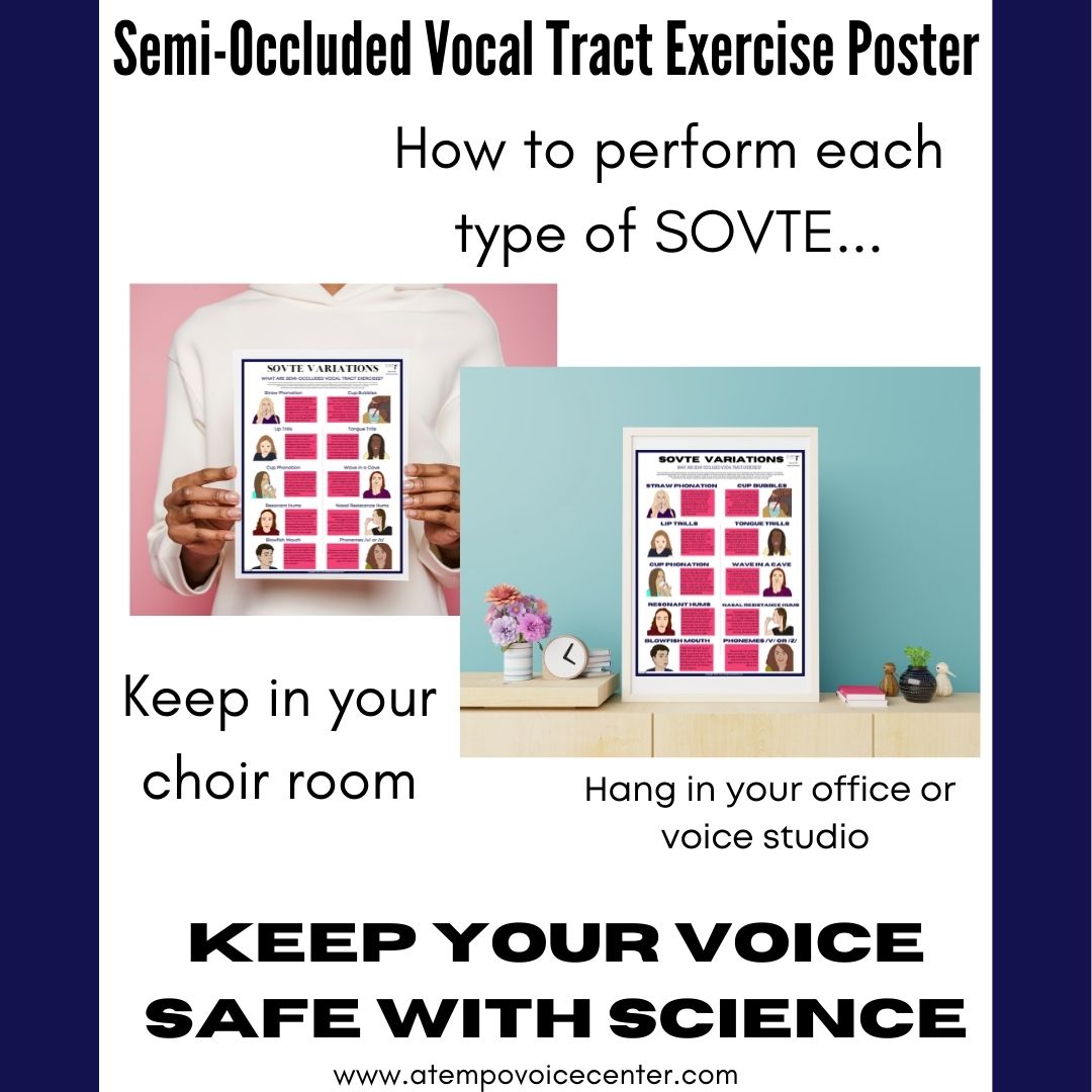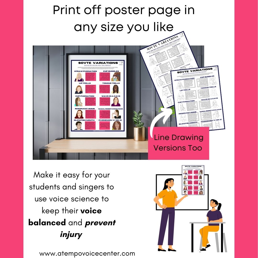 The Voice Exercise Poster (Semi Occluded Vocal Tract Exercises) has high-quality images and includes many of the options for rebalancing your voice with physiological changes using the science of backpressure. This concept has been heavily researched by Ingo Titze and proven to improve vocal efficiency and make vocalizing feel easier and less strained.