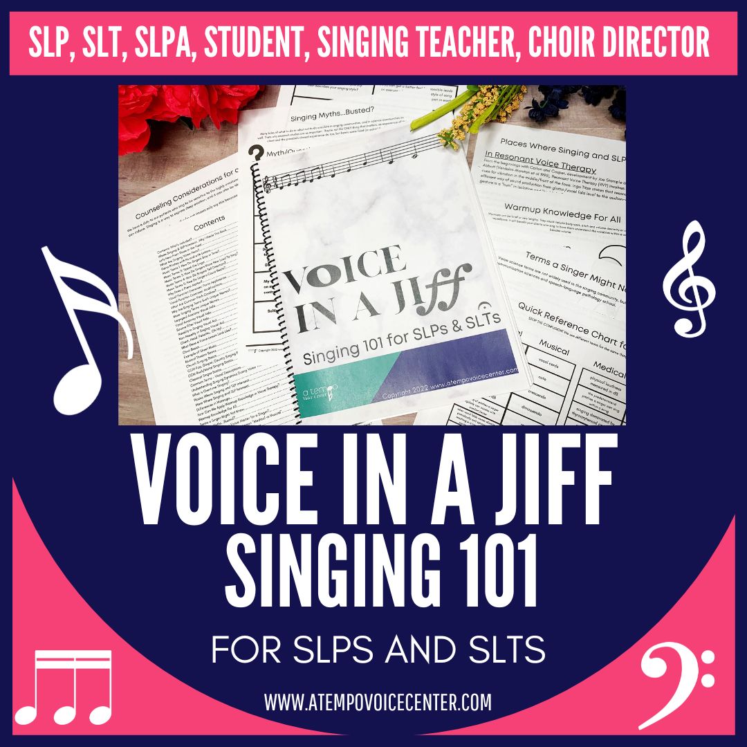 Voice in a Jiff: Singing 101 for Speech Language Pathologists and Speech Language Therapists is a downloadable manual for better understanding clients and patients who sing. Singers have a lingo all their own, and feel more comfortable explaining singing problems to someone familiar with singing terminology.
