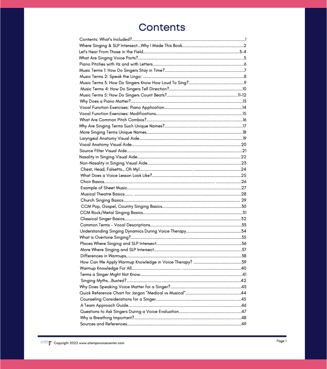 These are organized handouts with terms about singing voice types, singing voice settings, music, rhythm, piano basics, singing basics, how and where singing and SLP intersect, singing exercise explanations, visual graphics for head/chest voice differences, laryngeal anatomy graphics, vocal anatomy graphics, and so much more.