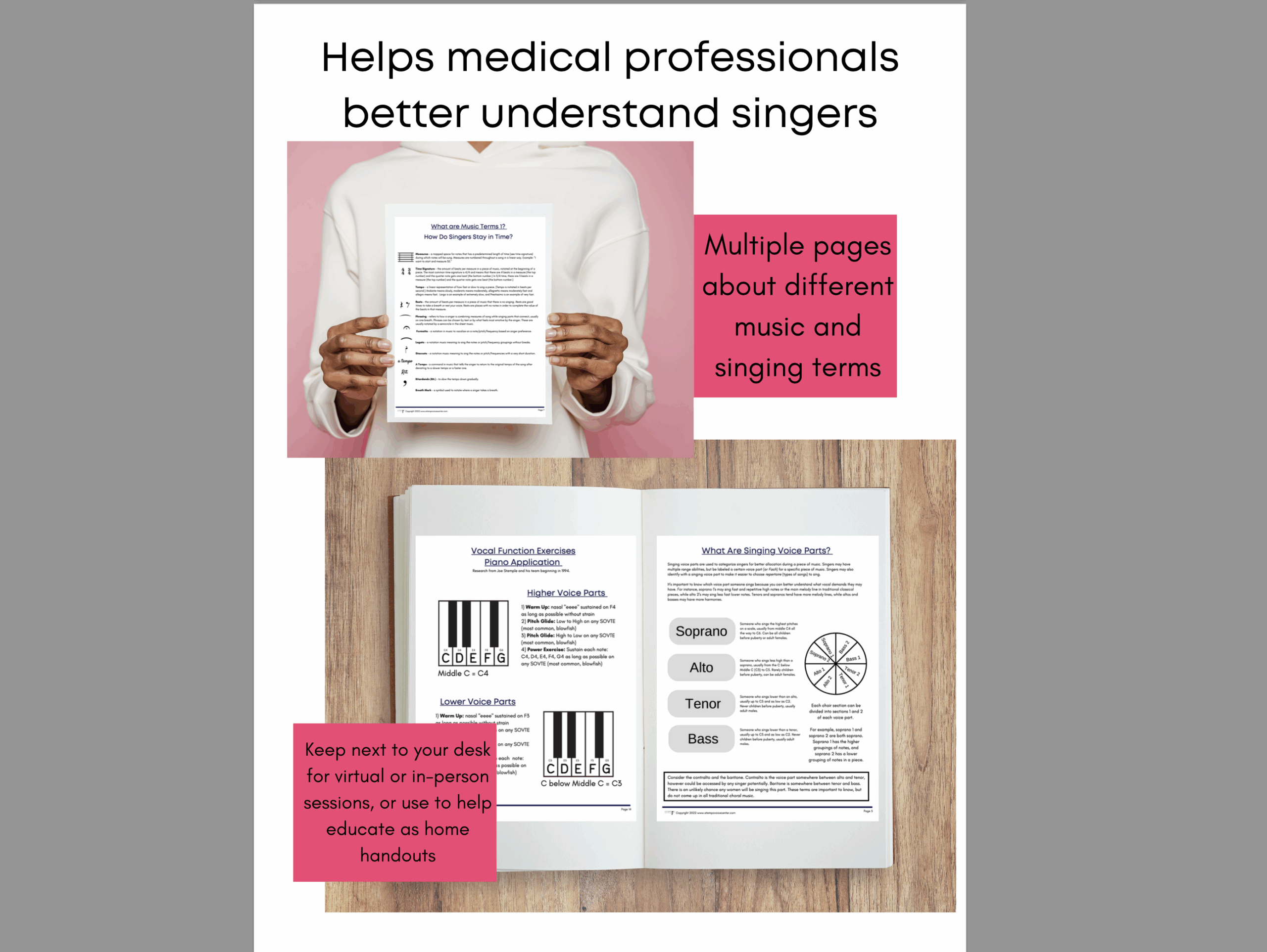 For clinicians of all kinds, even with minimal training in treating voice disorders or music, clear & concise terminology with visual examples help even brand-new musicians understand.