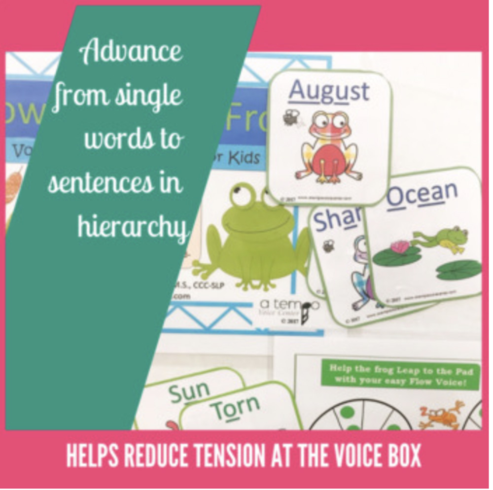 Flow Voice: Vowel Stretch Frogs for Voice Therapy. Use easy “flow voice” to help kids with nodules, polyps and vocal overuse patterns improve speech and voicing. Includes fun game board and 90 colorful kid-friendly cards. Includes Froggy Themed game board.